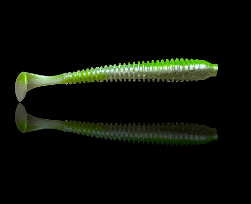 Der Schwerpunkt , wurde ganz klar auf seine unglaubliche Weichheit und auf seinen schmal verlaufenden Körper gelegt , diese beiden Komponenten geben den Fisch ein wirklich problemloses einsaugen des Gummifisch beim Biss .